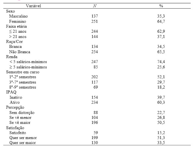 Foram entrevistados 388 estudantes com idades entre 18 e 60 anos (média = 21,0 anos; DP = 3,1). Destes, 64,7% eram do sexo feminino, 60,3% foram classificados como ativos, 32,2% apresentaram excesso de peso (homens 41% vs. 27,5% mulheres), 77,3% apresentaram distorção da imagem corporal, 33,5% desejavam ser maiores e 51,3% desejavam ser menores do que aparentavam ( tabela 1 ).