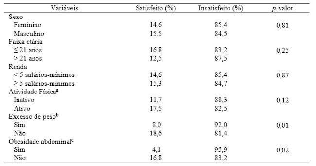 Em relação à obesidade abdominal, pode-se constatar que tanto entre os homens como entre as mulheres a associação com insatisfação corporal foi estatisticamente significante, o que pode ser devido ao fato da obesidade abdominal ser de mais fácil percepção dentre os que a detêm, sendo perceptível também para o sexo masculino (Andrade et al., 2017; Lima et al., 2018). Estudo realizado na Universidade Federal do Piauí, verificou que, dos 221 entrevistados com idade média de 18,3 anos (DP = 0,7), a obesidade abdominal esteve presente em 18% dos homens e 8% das mulheres. Notou-se que as médias de peso, altura e perímetro da cintura foram significativamente maiores no sexo masculino, entretanto, não foi encontrada diferenças estatísticas nas médias de IMC por sexo (Oliveira et al., 2019 ). Outros aspectos inerentes à vida acadêmica, como o estresse e hábitos alimentares não saudáveis são influenciadores do estado nutricional (Oliveira, Santos, Nascimento, & Santos, 2017), impactando o desenvolvimento de uma imagem corporal saudável, que é fundamental para o bem-estar social, emocional e físico dos indivíduos (Florencio et al., 2016 ).