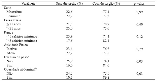 Indivíduos que possuíam excesso de peso ou obesidade abdominal apresentaram maiores prevalências de insatisfação e de distorção da imagem corporal. Esses achados são corroborados pelo estudo de Alves, Souza, Paiva e Teixeira (2017), que ao estudarem 1.265 acadêmicos, verificaram que 73,6% apresentaram-se insatisfeitos com o próprio corpo, sendo a maior proporção de insatisfação entre os estudantes com excesso de peso (52,3%), dos quais, a maioria era do gênero feminino. Estudos mostram que o excesso de peso constitui-se como fator desencadeante de distorção da imagem corporal (Vargas, Herrera Cantorani, Mauricio, & Annuniato, 2016), sendo frequente o relato de estudantes sobre insatisfação corporal e distorção da imagem (Florencio, Moreira, Silva, & Almeida, 2016).