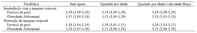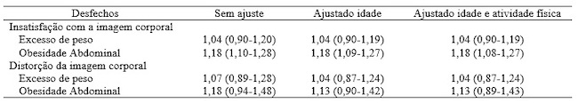 Entre as mulheres, a razão de prevalência de insatisfação corporal e presença de excesso de peso foi de 1,19 (IC95%: 1,09-1,30) em comparação às sem excesso de peso, enquanto entre as com obesidade abdominal foi 1,15 (IC95%: 1,04-1,26) em comparação com as não obesas. A razão de prevalência entre distorção da imagem corporal e presença ou ausência de excesso de peso foi de 1,18 (IC95%: 1,04-1,34), enquanto entre distorção da imagem corporal e presença ou ausência de obesidade abdominal foi de 1,20 (IC95%: 1,05-1,36). Essas associações foram mantidas após o ajuste por idade e atividade física ( tabela 5 ).