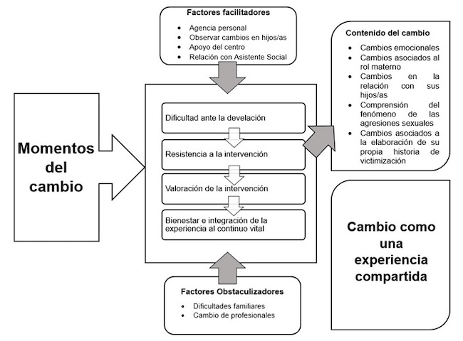 El contenido de los cambios identificados en la participante engloba cambios emocionales, cambios asociados al rol materno, mayor comprensión del fenómeno de las agresiones sexuales y la elaboración de su propia historia de victimización, lo que es similar a los cambios reportados en la literatura ( Dussert Chervellino, 2014 ).