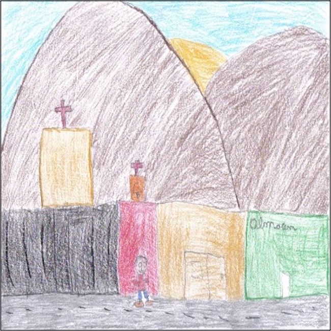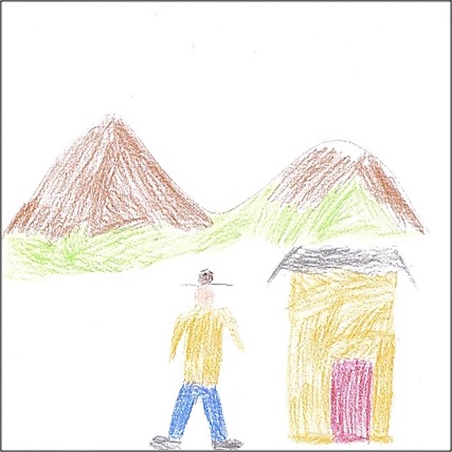 Tengo sombrero porque ahí voy al campo. Cuando no hay clases voy en la mañana poh. Y en la tarde igual hay un poco de sol cuando salimos. Estoy cerca de mi casa. Yo vivo un poco más arriba, cerca del banco. Por ahí mi abuelo va al campo, y va a los cerros. Mi abuelito… tiene ovejas, mi hermano tiene igual, yo también, mi mamá no tiene. Estos son los cerros. También hay pasto en los cerros, yo con mi tío voy al cerro y ahí vamos a pastear, a veces vamos a Chuca . . . es un cerro alto (Raúl, 7 años).
