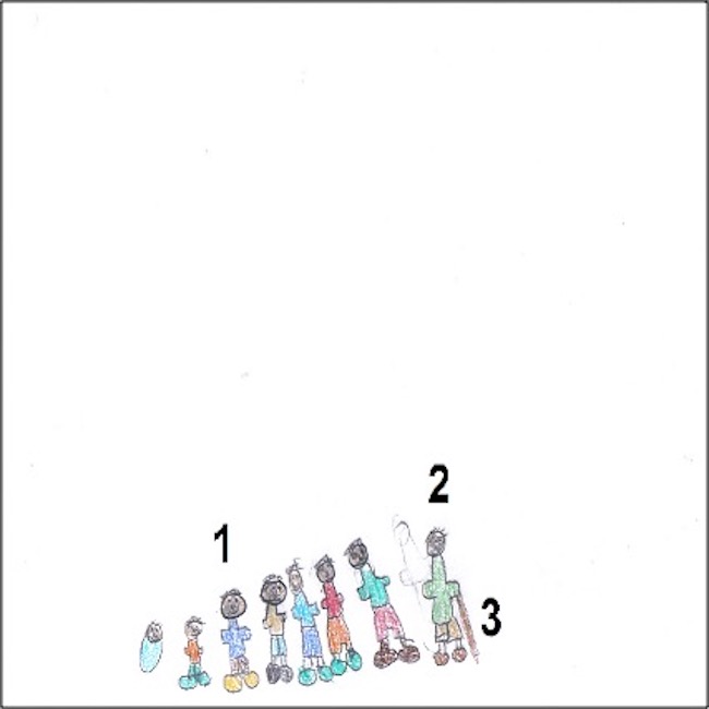 El contexto no andino también fue valorado favorablemente, siendo Arica referida por todos los niños. Se valora las oportunidades y características que brinda la urbanización, en la parte recreacional, mayores accesos a bienes y servicios, el vínculo con familiares viviendo allí, y por sus propias características ambientales (costa). Existieron narrativas diversas, donde se valoraba positivamente Putre y negativamente Arica, y otras donde no era totalmente clara la preferencia. En otras, se visualizaba el futuro en Arica, estudiando, pero regresando a Putre para visitar, conservando las experiencias que el entorno andino ha provisto a la construcción de la identidad, pese a la lejanía. Esta última se observó en la siguiente viñeta (ver figura 5 ), agregando el borrado en la representación del sí mismo en el futuro y agregando un palo de pastoreo, además de reforzarse a nivel verbal.