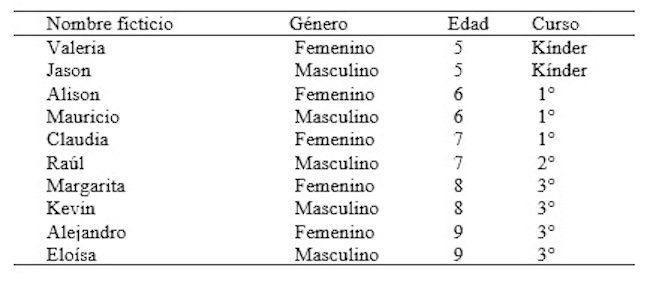 Los participantes que conformaron la muestra asistían al Liceo Técnico Profesional Granaderos de Putre, establecimiento municipal y el único de la provincia que presenta matrícula preescolar, educación básica (primaria) y media (secundaria). De la correspondencia entre edad y curso que rige actualmente en la escolarización chilena, se estimó que entre kínder a cuarto año básico se encontraría el rango etario a estudiar, accediendo a estos cursos para llegar a los participantes que conformarían la muestra final. Se desarrolló la actividad con 37 participantes autorizados. Se seleccionaron diez casos para el análisis en profundidad, los cuales fueron representativos según el criterio de saturación orientado a la exhaustividad, la relevancia y la novedad teórica de la información que estos exhibían (Patias & Hohendorff, 2019). Todos los participantes tenían apellido(s) de origen aymara (ver tabla 1 ).