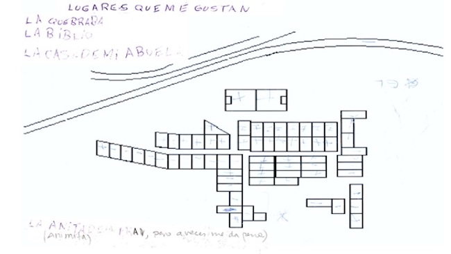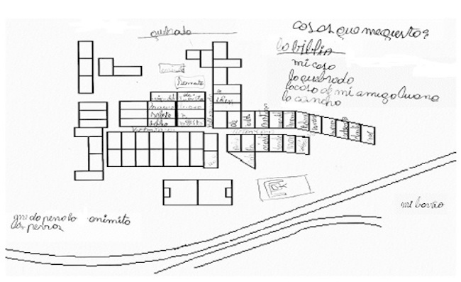 Con el mapa o plano del campamento entregado en papel por el equipo de investigación a niños/as se inició la técnica con dibujos y escritos sobre el mapa. El bienestar, en este sentido, fue reconocido en torno a la posibilidad de reunirse con sus amigos/as durante el tiempo libre que pasan en la casa, la biblioteca y la escuela (lugares cerrados), la cancha, la quebrada y la zona de juegos (lugares abiertos) que son su entorno físico y natural más cercano.
