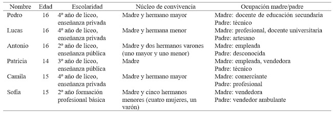 El estudio fue diseñado siguiendo una metodología cualitativa por considerarse la más adecuada para lograr los objetivos propuestos. Se definió que la población del estudio serían adolescentes mujeres y varones entre 14 y 18 años, jerarquizando su lugar de actores y agentes de producción de conocimiento (ver tabla 1 ). Se planteó una convivencia de al menos cinco años con uno solo de los progenitores, ya que se consideró que este tiempo caracterizaría una rutina consolidada. No se excluyeron adolescentes que mantuvieran vínculo con el otro progenitor, y lo que definió su inclusión es el mayor tiempo de convivencia con uno solo de ellos porque el foco de atención pasó a ser el hogar o la situación de monoparentalidad. Se excluyeron adolescentes con discapacidad física, psíquica o intelectual. Se conformó una muestra por conveniencia siguiendo los criterios de inclusión mencionados y por técnica de bola de nieve. La muestra quedó conformada por seis adolescentes que viven con sus madres, es decir, en hogares monoparentales con jefatura femenina. En todos los casos la situación de monoparentalidad se produce luego de la ruptura conyugal de la pareja parental.