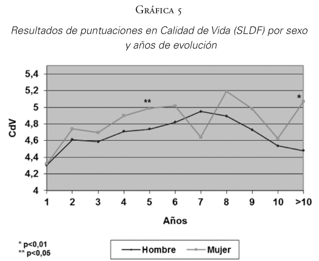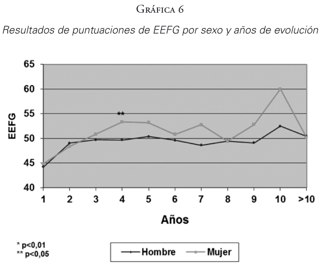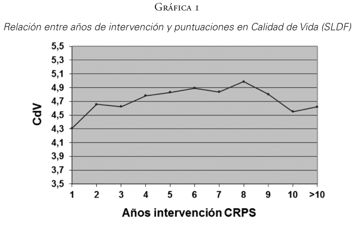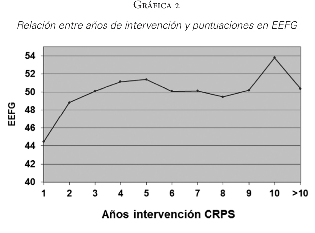En las gráficas 1 y 2, se observa un aumento significativo (p<0,01) de las puntuaciones medias de las escalas de Calidad de Vida (SLDF) y EFFG según transcurren los años en los centros, pero a partir del octavo año en Calidad de Vida (SLDF) y del quinto año en EFFG la tendencia se pierde (la puntuación del año >10 corresponde a la agrupación de puntuaciones de más de 10 años de intervención).