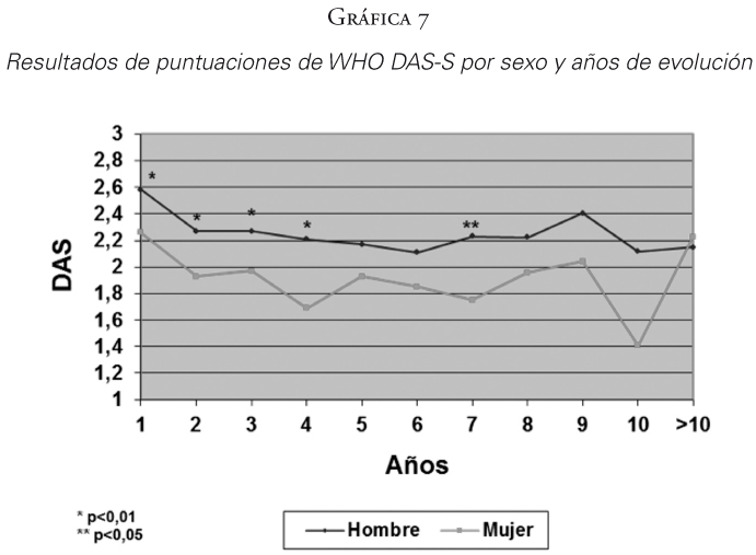 En el WHO DAS-S Global las puntuaciones descienden y por tanto mejoran de la discapacidad según pasan los años (p<0,01) perdiéndose la tendencia entre el cuarto y quinto año (Gráfica 3).