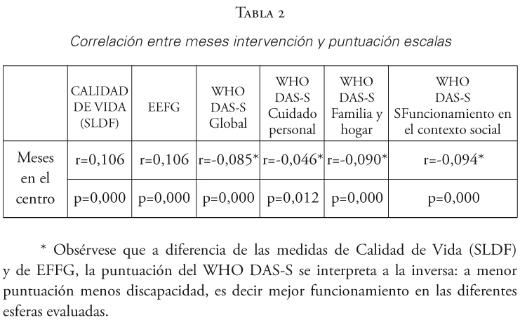 Se observa una correlación estadísticamente significativa en todas las medidas, excepto en WHO DAS-S-Ocupación, entre el número de meses de intervención y las puntuaciones en la escala, es decir las personas con más meses de intervención obtienen mejores puntuaciones. (Ver tabla 2)