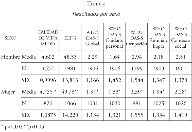 Obsérvese que a diferencia de las medidas de Calidad de Vida (SLDF) y de EFFG, la puntuación del WHO DAS-S se interpreta a la inversa: a menor puntuación menos discapacidad, es decir mejor funcionamiento en las diferentes esferas evaluadas.