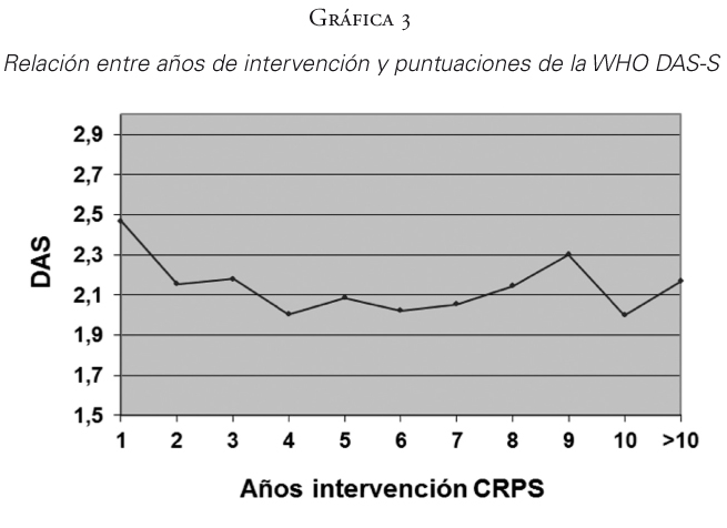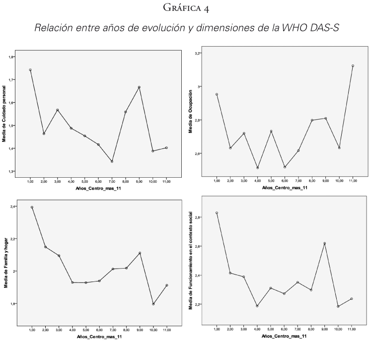 Al analizar las puntuaciones del WHO DAS-S por cada dimensión se observa también un descenso de las puntuaciones medias según se incrementan los años de intervención y por tanto mejoran de su discapacidad (p<0,01), perdiéndose la tendencia entre el quinto y el séptimo año. No es significativo en las medidas de WHO DAS-S-Ocupación (Gráfica 4).