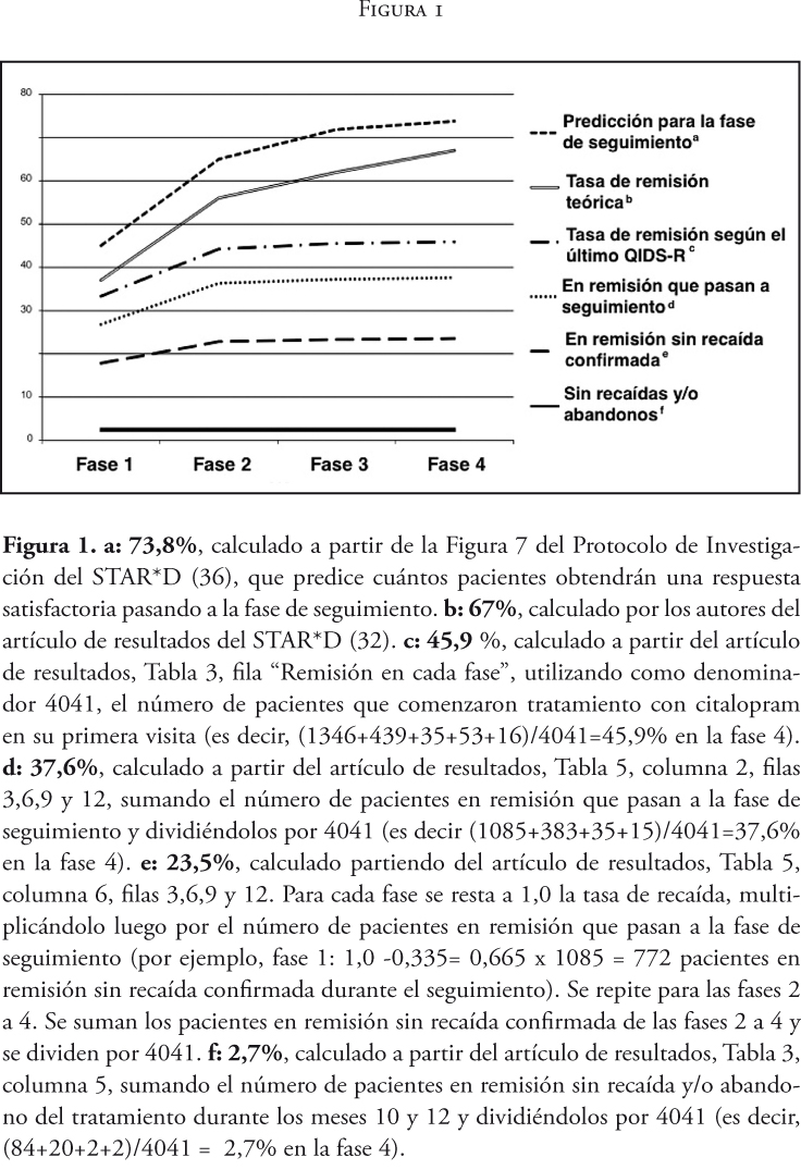 El Protocolo de Investigación del STAR*D presenta en su figura 7 unas predicciones paso a paso de los abandonos y del número de pacientes que obtendrían una respuesta satisfactoria y pasarían a la fase de seguimiento. Se declara que “obtuvimos estas estimaciones mediante tres experimentados clínicos (Drs. Fava, Rush y Thase), que, independientemente, llegaron a estimaciones sorprendentemente cercanas unas de otras…, estimaciones hipotéticas procedentes en gran medida de los resultados de los ECA publicados” (36, p. 31). El propósito inicial de estas estimaciones era calcular el número de pacientes que a lo largo del estudio estarían disponibles para su aleatorización en las fases 2-4 con objeto de asegurar un poder estadístico suficiente en las comparativas diseñadas. No obstante, se convirtieron en la hipótesis central del STAR*D, sometiendo a prueba hasta qué punto se podían predecir los resultados agregados “fase a fase” de un tratamiento con antidepresivos óptimamente administrado y basado en un modelo secuencial de “tratamiento hasta la remisión”.