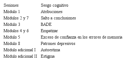 El entrenamiento metacognitivo para la esquizofrenia (MCT) es una intervención basada en conceptos de la psicoeducación, la rehabilitación cognitiva, el entrenamiento en CS, la ToM y la terapia cognitivo-conductual. El programa tiene como objetivo modificar errores y sesgos cognitivos comunes en la esquizofrenia, partiendo del supuesto de que estas distorsiones pueden evolucionar hasta la creación de falsas creencias o, en última instancia, convertirse en delirios (119). Se desarrolla a través de ocho módulos y dos módulos adicionales (Tabla 1). Tiene por objeto aumentar la conciencia sobre cada una de las distorsiones y enseñar a reflexionar sobre ellas de una forma crítica, para cambiar y ampliar el actual repertorio de habilidades cognitivas (119). El manual y los módulos para su aplicación están disponibles en varios idiomas, incluyendo el español, de manera gratuita en la web de los autores (https://clinical-neuropsychology.de/mct-psychosis-manual-spanish/).