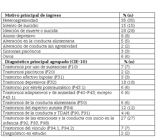 Respecto al perfil de paciente, se realizó un estudio descriptivo en la Unidad en el que se evaluaron las características de los 100 primeros adolescentes ingresados, siendo la media de edad (DT) de estos de 15,1 (1,4) años. El 65% fueron chicas y el 35% restante chicos. El 79% de todos ellos eran de etnia caucásica, el 9% latinoamericana, el 8% asiática y el 4% africana. El 92% habían tenido contacto previo con algún dispositivo de Salud Mental y el 78% tomaba tratamiento psicofarmacológico antes del ingreso. A continuación, se muestran en la Tabla 1 los motivos de ingreso y los diagnósticos principales.