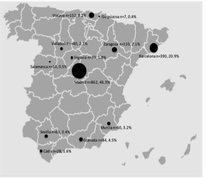 Provincia, n= número de pacientes en esa provincia, %= porcentaje sobre el total de pacientes del estudio (n=1862).