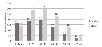 De los 1862 pacientes del estudio, el 60% eran mujeres (n=1113). El 68% de los pacientes tenían menos de 40 años. La cuarta década de la vida es a la que pertenecen mayor número de pacientes (26,3%), seguida de la tercera década, con un 25,1% (Tabla 3).