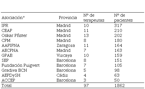 Se recibieron registros de 1862 pacientes, que fueron recogidos por 97 psicoterapeutas-investigadores pertenecientes a 12 asociaciones psicoanalíticas de la FEAP (Tabla 1).