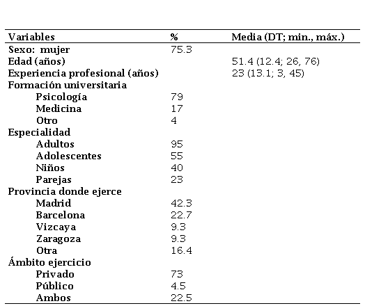 Por tanto, el perfil más frecuente del terapeuta participante en este estudio es: mujer, de 51,4 años, psicóloga, con 23 años de experiencia profesional, especializada en adultos, que trabaja en el ámbito privado y que reside en Madrid o Barcelona (Tabla 2).
