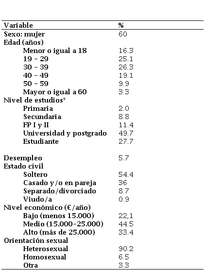 La variable Estado civil se resume como sigue: mayoría de hombres estaban solteros (61,6% frente al 49,7% de mujeres; p<0,001), el 38,4% de las mujeres estaban casadas o en pareja (frente al 32% de los hombres; p<0,001) y el 11% de las mujeres estaban separadas o divorciadas (frente a un 5,5% los hombres; p<0,001). Respecto a la variable Profesión, había más mujeres con profesión cualificada (53,7% vs. 50,7%) y en situación de desempleo (6,9% vs. 3,9%), mientras que más hombres eran estudiantes (30,3% vs. 22,7%; p=0,01). El 40% de nuestra población tiene formación universitaria (34,1% de los hombres y 43,8% de las mujeres) y el 9,7% estudios de postgrado. El Nivel económico fue medido en función de los ingresos anuales, en tres categorías: el nivel medio (15.000-25.000 €/año) fue más frecuente en la mujer (46,3% vs. 41,8%; p=0,029), mientras que el nivel alto (más de 25.000 €/año) lo fue en los hombres (36,9% vs. 31%; p=0,029) y no hubo diferencias por sexos respecto al nivel bajo (menos de 15.000 €/año). En la variable Orientación sexual, el 90,2% de los pacientes eran heterosexuales (87,1% hombres vs. 92,4% mujeres; p<0,001) y el 6,5% eran homosexuales (9,8% hombres vs. 4,3% mujeres; p<0,001).