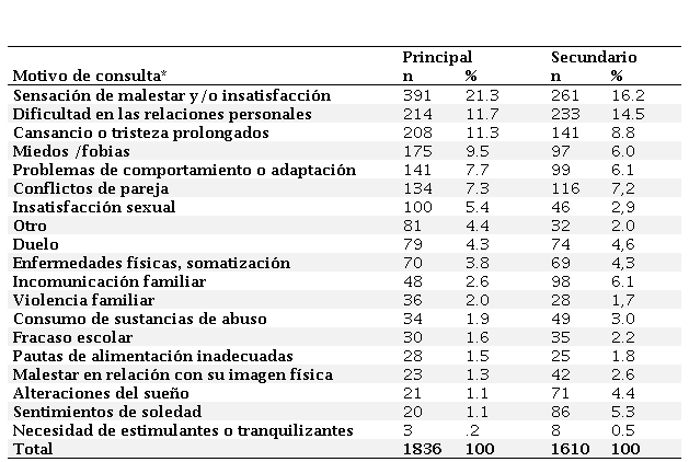Con relación a las variables Motivo de consulta principal y secundario (Tabla 4), la sensación de malestar y/o insatisfacción fue el motivo de consulta principal más frecuente tanto de manera general (21%) como en el análisis por sexo. Existen diferencias estadísticamente significativas en los motivos de consulta “problemas de comportamiento o adaptación” (10,5% hombres vs. 5,6% mujeres; p<0,001) e “insatisfacción sexual” (10% hombres vs. 2% mujer; p<0,001) siendo estos más frecuentes en los hombres. En cambio, fue más común en mujeres que consultaran por “sensación de malestar y/o insatisfacción” (18% hombres vs. 23% mujer; p=0,019) y “cansancio o tristeza prolongados” (8% hombres vs. 13% mujer; p<0,001).