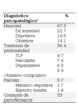 Los diagnósticos relacionados con la salud mental que encontramos con mayor frecuencia en la literatura son los trastornos depresivos y los de ansiedad (3,4,12-14,16,23,35-38). En nuestro estudio utilizamos la clasificación psicopatológica propuesta por Joan Coderch (57). En la mayoría de los trabajos consultados, incluyendo los de orientación psicodinámica, utilizaron las clasificaciones DSM y/o CIE para referirse a la psicopatología. Desde una perspectiva clínica, especialmente psicoanalítica, el DSM-5 presenta serias limitaciones. Como ocurría con sus antecesores, casi todo el énfasis se coloca en lo que es posible observar y describir, prestando escasa atención a las estructuras subyacentes menos visibles, las dinámicas y los significados. Esta es una de las razones principales de que se siga dando vueltas al debate “diagnóstico categorial – diagnóstico dimensional” (58). En nuestro estudio, en concordancia con lo publicado en la literatura, los diagnósticos más comunes fueron la neurosis de ansiedad (22,7%) y la depresiva (19,6%). En su conjunto, un 67,3% de nuestra población fue diagnosticada de una neurosis, entendiendo como tal un trastorno mental leve. No olvidemos que estos diagnósticos fueron impresiones iniciales de los terapeutas, basadas en los datos recogidos durante las primeras entrevistas. Se trata pues de un diagnóstico sindrómico, una foto estática inicial, que es un elemento más y no el único de la evaluación inicial del paciente. Los trastornos de la personalidad fueron el segundo grupo de diagnósticos más frecuentes, presentes en un 36,4% de los casos. Los más comúnmente diagnosticados fueron el trastorno límite de personalidad (9,7%, más frecuente en mujeres) y el narcisista (7,4%, más frecuente en hombres). Los trastornos de la personalidad no son fáciles de diagnosticar, por lo que su prevalencia generalmente está infraestimada. En parte, este infradiagnóstico se da por carencia de síntomas y otras veces por ausencia de conciencia de enfermedad por parte del paciente (58,59). En dos estudios españoles realizados en población psiquiátrica, las prevalencias comunicadas de trastorno de personalidad fueron muy similares a las nuestras: 40,1% (60) y 39,4% (61). Sin embargo, hay cifras muy dispares publicadas en otros estudios, entre 3,7% y 91% (59). Las psicosis son el grupo menos frecuente de nuestra muestra, con un 5,7% de los pacientes dentro de este diagnóstico. Las cifras de prevalencia de psicosis en población general están en torno al 0,5–1,5% según los estudios, pudiendo llegar al 2,5% en poblaciones con elevada concentración de factores de riesgo (62). Según el estudio multinacional EU-GEI (63) que incluía a España, existe una importante heterogeneidad en el riesgo de los trastornos psicóticos en función de las personas y de los lugares.