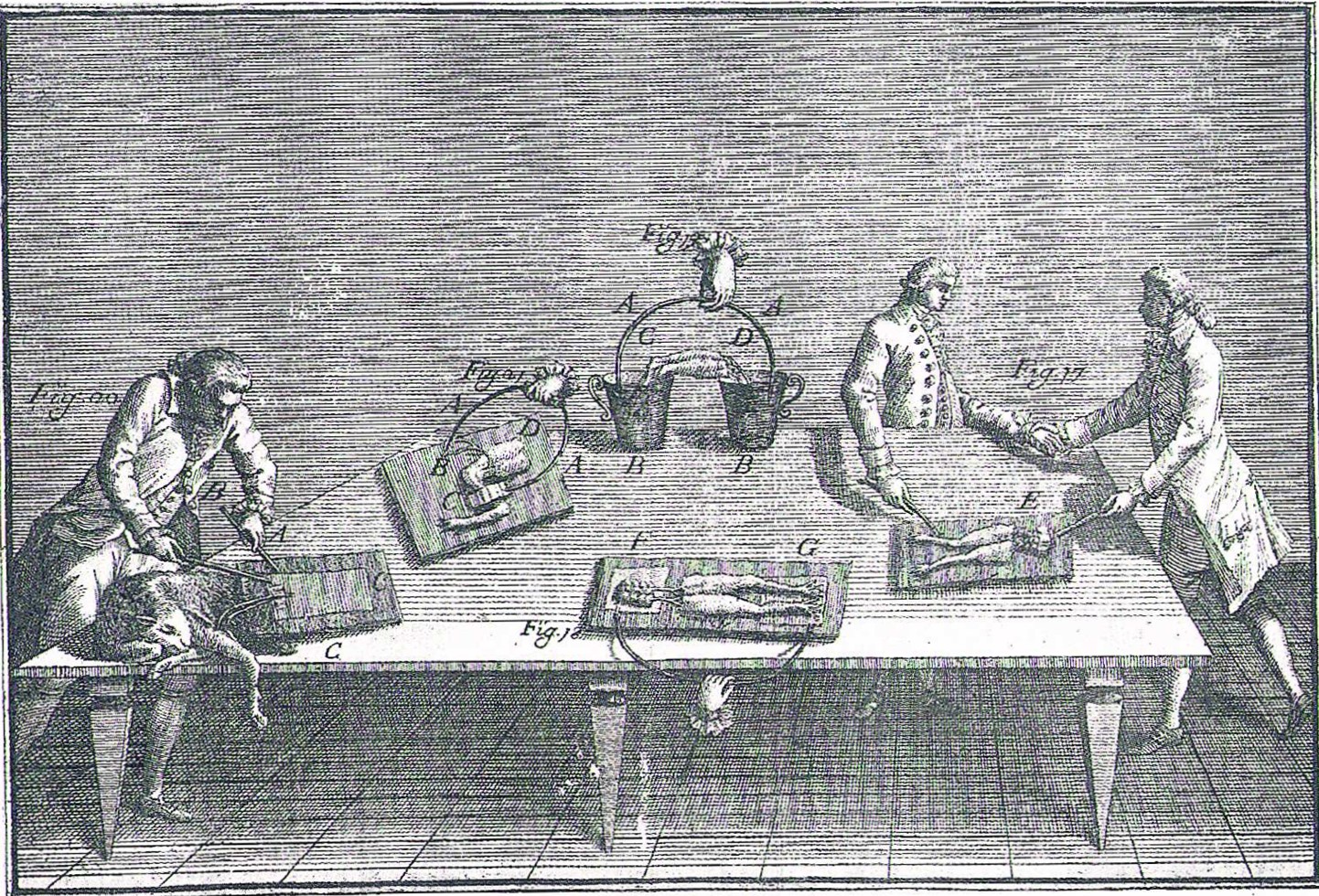 La teoría cartesiana de los espíritus animales como agentes responsables del funcionalismo nervioso también fue denostada, especialmente a partir de los experimentos fisiológicos de Francis Glisson (1597-1677) sobre la irritabilidad muscular. No obstante, ya casi un siglo antes Niccolò Massa (1485-1559) había demostrado que los ventrículos cerebrales no contenían ningún “viento sutil”, sino una sustancia líquida, conocida posteriormente como líquido cefalorraquídeo. Durante el último tercio del siglo XVIII, y debido al gran desarrollo en algunos ámbitos, como la electrofisiología o la microscopía, esta teoría perdió todo su respaldo. Luigi Galvani (1737-1798) describió, en 1780, el efecto de la corriente eléctrica en la contracción de los músculos de la rana (Figura 9) y Felice Fontana (1730-1805), en 1781, describió microscópicamente la estructura histológica de las fibras nerviosas, aportando los datos definitivos que confirmaban la ausencia de espacios huecos en el interior de los nervios (16, 17, 20).