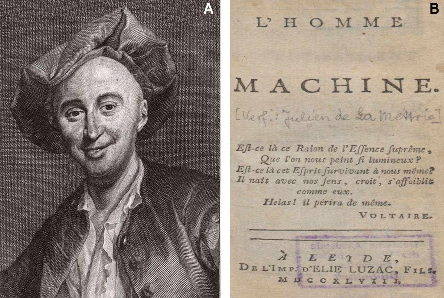 El declive del concepto científico del alma racional fue ya muy evidente durante el periodo de la Ilustración. Julien Offray de La Mettrie (Figura 10A), uno de los defensores más radicales de la nueva corriente materialista del siglo XVIII, atacó duramente los postulados de Descartes sobre el alma racional en su obra L’Homme-machine (Figura 10B), publicada en 1748, en la que defiende que el hombre es superior a los animales, no porque disponga de una sustancia espiritual, sino, simplemente, porque su cerebro está más desarrollado (32, 36). Más aún: a todas estas razonables críticas anatómicas en relación a los espíritus animales y la ubicación del alma humana se fueron sumando otras de naturaleza eminentemente filosófica. Por ejemplo, David Hume (1711-1776) defendía en 1739 que en la personalidad se daban cita todas las experiencias sensoriales, y, por tanto, el hecho de enclaustrar la mente en una jaula anatómica no sería otra cosa que una pura ilusión (37). A este planteamiento también se unió posteriormente Immanuel Kant (1724-1804), para quien el alma debe poseer una naturaleza netamente espiritual y desvinculada por completo de lo físico, por lo que no sería factible que se ubicase en una localización anatómica concreta (38).