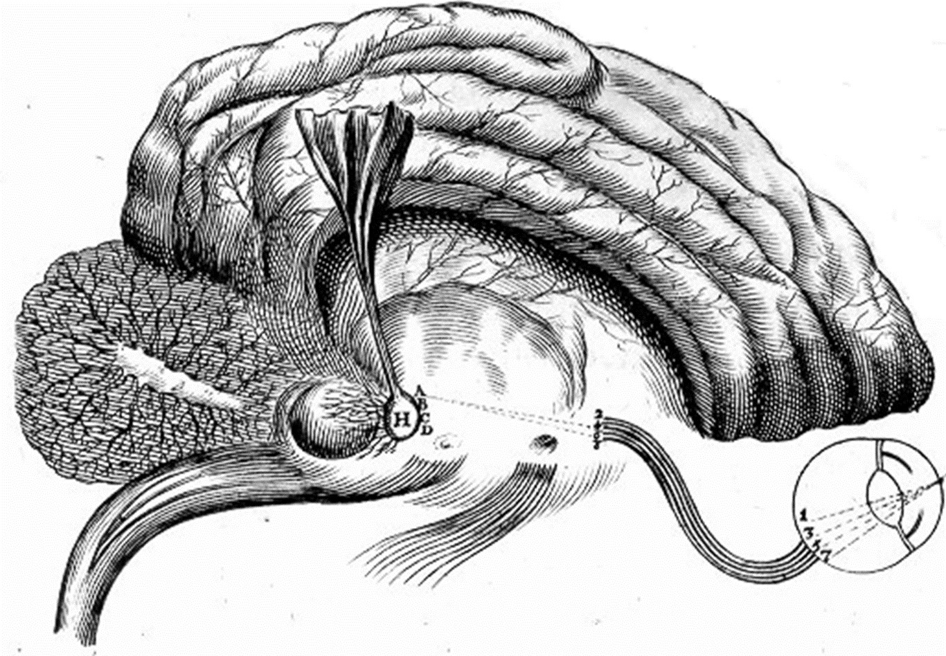 En su afán por explicar la plácida relación que debiera imperar entre el cuerpo y la psique, Descartes plantea la necesidad de que el alma humana, su res cogitans, disponga de una ubicación física desde donde poder ejercer el gobierno del cuerpo (14). Y de esta forma, el filósofo asienta este trono en “la más interior de las partes del cerebro”, esto es, en la glándula pineal o como la denominaban los anatomistas clásicos, la epiphysis cerebri(15,16,17,18). Sin embargo, Descartes, que, a pesar de disponer de ciertos conocimientos de anatomía, no era médico ni experto en esta materia, situaba erróneamente, a la conveniencia de sus teorías, la localización del órgano pineal: a nivel rostral del sulcus lateralis cerebri, estructura que sirve de conexión entre los ventrículos III y IV, y pendiente de unas arteriolas, en vez de unida al resto de la substancia cerebral (Figura 4). De esta forma, se garantizaría una excelente protección y defensa frente a posibles lesiones y patologías (19).