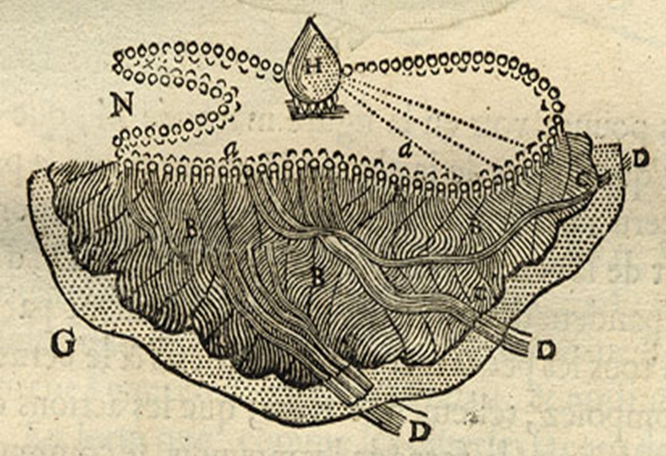 La teoría fisiológica cartesiana establece que la glándula pineal sería el centro de recepción de las percepciones sensoriales externas y daría lugar, con la mediación de los espíritus animales, a los movimientos musculares de la “máquina” corporal (12). El órgano pineal estaría dotado de movilidad, y estos movimientos desplazarían y reconducirían a los espíritus animales, atravesando los poros que hipotéticamente existirían en la superficie interna de ventrículos cerebrales, susceptibles de abrirse o cerrarse por la intensidad de los estímulos sensoriales (Figura 5), hacia los diferentes músculos de la anatomía para que ejerzan el movimiento del cuerpo.