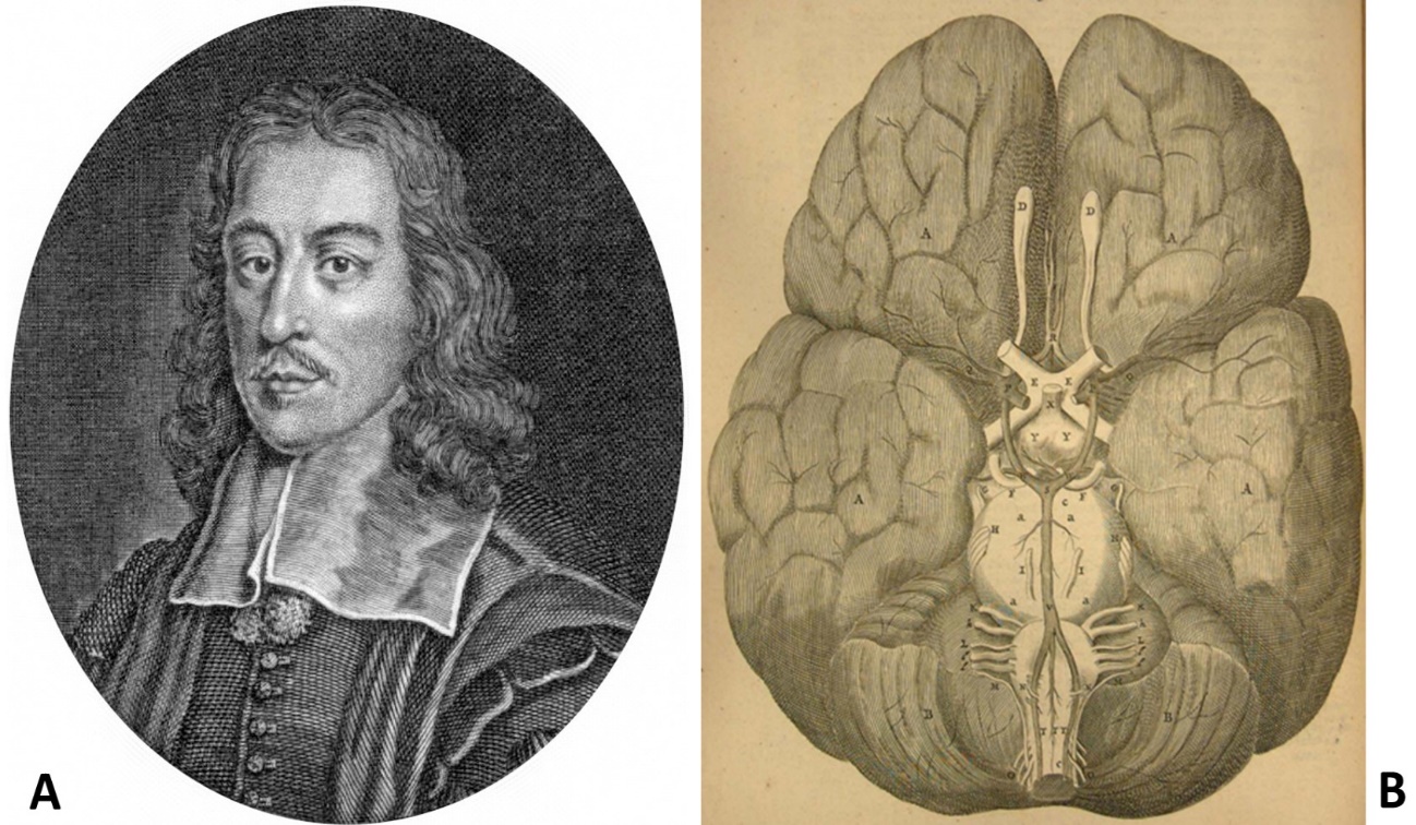 La influencia de los postulados de Descartes en el trabajo de Willis (Figura 7A) es tremendamente manifiesta. La actividad de Willis se vio favorecida por el diferente ambiente cultural que se vivía en la Gran Bretaña de su época, bajo la influencia filosófica de Francis Bacon (1561-1626), frente a una Europa continental más anclada en las clásicas doctrinas aristotélicas que no favorecían un adecuado desarrollo de la ciencia. Willis, al amparo de este ambiente más laxo en materia teológica, sometido a una menor persecución eclesiástica y, por tanto, más afín al desarrollo de una perspectiva más positivista de las cuestiones científicas, pudo profundizar en los planteamientos neurofisiológicos cartesianos. Para él, los espíritus animales se asimilarían al “alma corporal”, aunque su naturaleza, en opinión del científico británico, sería de carácter lumínico. Y, al contrario de los apuntado por Descartes, estos no recorrerían el interior hueco de los nervios, sino que se deslizarían por la superficie de los mismos (24).