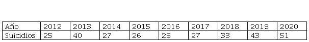En cuanto a los 43 suicidios mencionados, 38 eran hombres y 5 mujeres. El método de suicidio fue el ahorcamiento en 38 casos, en dos la autolesión, en dos la ingestión de psicótropos y en un caso no se ha podido determinar el método. El número de suicidios el año anterior había sido de 33, por lo que se ha incrementado en diez personas. Tanto el número de suicidios como la tasa (0,85 por 1.000 internos) son los más altos desde 2014. Debe reiterarse la preocupación por el número de suicidios, con cifras significativas en esta década pasada (Tabla 1):