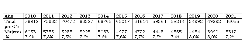 En la población reclusa, el porcentaje de mujeres presas en las cárceles españolas desde 2010 ha sido de un 7,6% de media, siendo la más elevada en Europa occidental, donde el porcentaje es del 4,5%. Además, tenemos una de las tasas más altas de mujeres extranjeras encarceladas (27). En nuestro país, a pesar de la reducción de penas, seguimos teniendo unas tasas de personas encarceladas por toxicomanías superiores a nuestro entorno europeo, solo comparables a las de Italia (28).