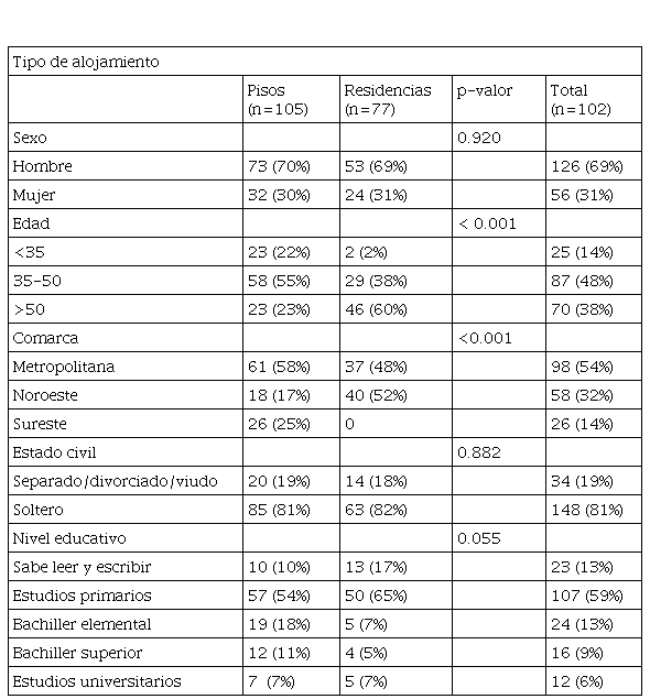En el estudio participaron 182 personas: 105 (57.8%) alojadas en una de las 18 viviendas supervisadas y 77 (42.2%) en una de las 4 residencias. A los pacientes se les explicó verbalmente el estudio y se les pidió consentimiento informado por escrito. 4 pacientes (alojados en residencias) no quisieron participar.