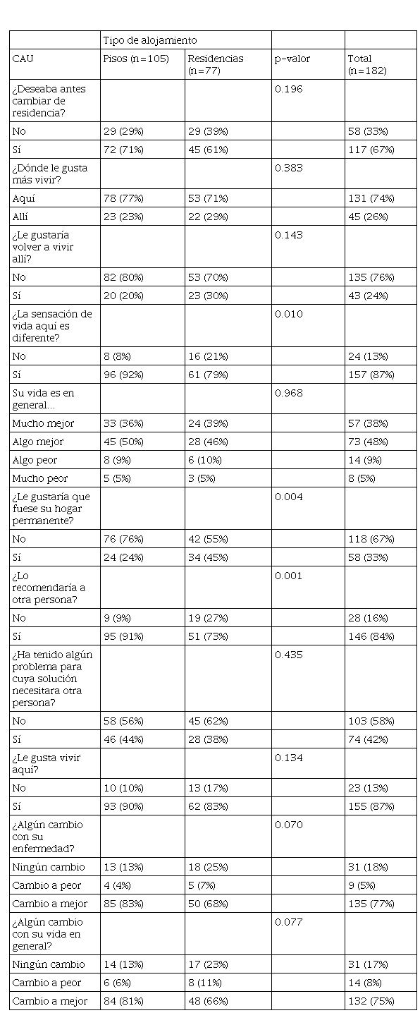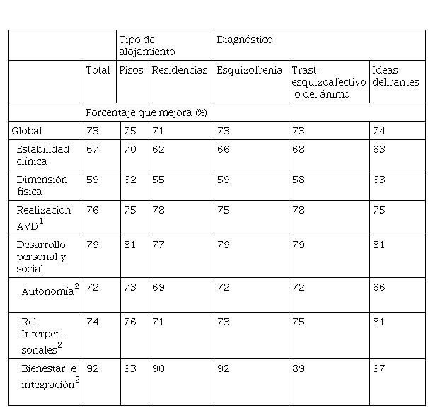 El porcentaje de usuarios que mejoró fue similar en pisos y residencias (73% globalmente), y lo mismo ocurrió cuando se analizó en función del tipo de diagnóstico clínico (Tabla 5 ).