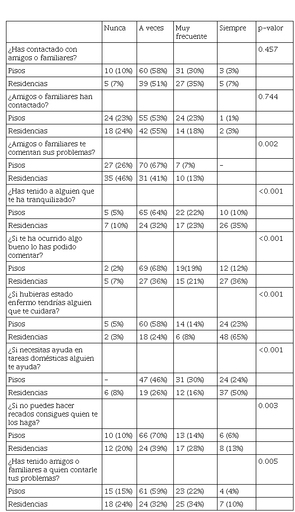 a) En los pisos, en los mayores de 50 años la puntuación fue superior a la del resto de edades para el factor “apoyo social práctico” y en los menores de 35 años para el factor “apoyo afectivo”. No hubo diferencias significativas en los otros dos factores.