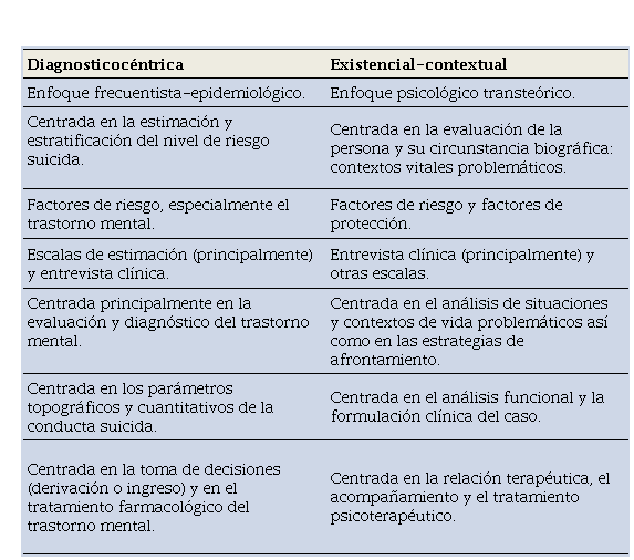 Para una visualización más detallada de las diferencias entre evaluación diagnosticocéntrica y existencial-contextual del suicidio, véase la Tabla 4.