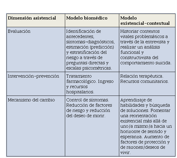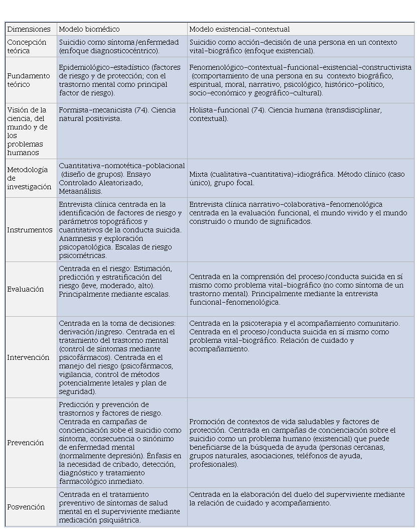 El modelo biomédico y el existencial-contextual del suicidio se diferencian en una serie de dimensiones, como se muestra en la Tabla 1.