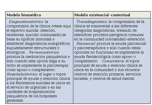 El modelo biomédico del suicidio, según se aplica en los sistemas sanitarios de nuestro entorno, se caracteriza por ser diagnosticocéntrico, farmacocéntrico y hospitalocéntrico. El existencial-contextual, en cambio, se caracterizaría por ser transdiagnóstico, psicosocial y comunitario. Véase Tabla 2.