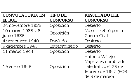 Una Orden de 18 de noviembre de 1933 convocó la provisión de la cátedra por el turno de oposición libre (40) y en marzo de 1934 se hizo pública la siguiente relación de admitidos a la convocatoria: José Mª Aldama Truchuelo (1900-1970), Román Alberca Lorente (1903-1967), José Mª Villaverde Larrar (1888-1936), Ángel Suils Pérez (1906-?), Juan José López Ibor (1906-1991) y Miguel Prados Such (1894-1969); siendo excluidos de la misma: Enrique Fernández Sanz (1872-1950), Wenceslao López Albo, Saturnino Ángel Domínguez Borreguero (¿-1979), Dionisio Nieto Gómez (1908-1985) y José Miguel Sacristán Gutiérrez (1887-1957) (41).