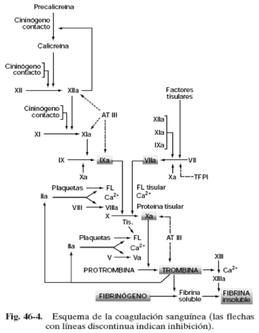 Como se puede observar, en la cascada de la coagulación hay unos factores biológicos que son precursores de otros, lo que quiere decir que la síntesis del coágulo sanguíneo depende de la síntesis de sus precursores biológicos (factores de la coagulación). La cascada termina con la síntesis del factor Xa, que, a su vez, posibilita la síntesis de fibrina, a partir del fibrinógeno. La fibrina es la proteína insoluble y filamentosa que proporciona el carácter semisólido al coágulo sanguíneo. La cascada de la coagulación es así un sistema biológico secuencial, cuyos elementos se estudian en interacción mecánica y lineal, lo que permite que el circuito pueda ser farmacológicamente interrumpido. Los fármacos anticoagulantes impedirían el decurso mecánico de este sistema como una pieza insertada en el mecanismo, provocando el cese de su funcionamiento (la interrupción de la coagulación).