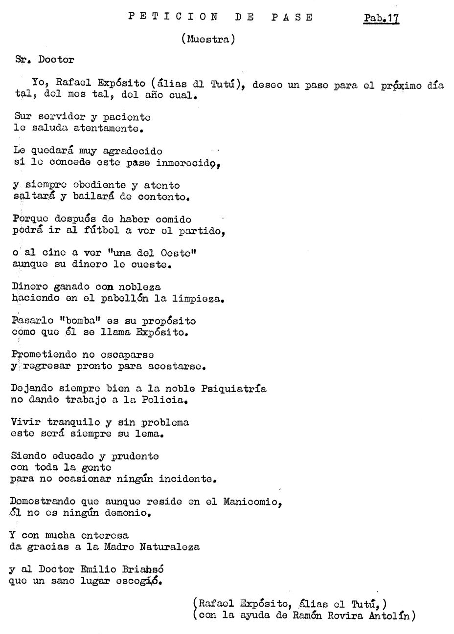 Seguramente la publicación de sus escritos y dibujos tuvo que ser un estímulo para los pacientes. Más allá de los colaboradores ocasionales, las publicaciones contaron con un puñado de entregados articulistas, quienes encontrarían así cierto sentido a su existencia intramuros. Para algunos, sería la mejor forma de dar salida a sus inquietudes intelectuales o adquirir un cierto prestigio. Ese pudo ser el caso del grupo de los “intelectuales” de El Palmar en Murcia, quizás así denominados con mezcla de reconocimiento y cierta ironía, o parte de los colaboradores que durante años, incluso décadas, se ocuparon de las tareas editoriales en Reus o Zaragoza. Independientemente de lo anterior, su dedicación también pudo suponer algunos otros beneficios más tangibles, desde la cercanía y accesibilidad al personal asistencial hasta la ventaja en eventos institucionales como las excursiones. Para otros, quizás primó el deseo de aparecer como “buen enfermo” y recibir su recompensa, como reflejaba aquel que, con magistral ironía, firmaba la poesía titulada “Petición de pase” (Imagen 2). Y, en casos extremos, también pudo despertar ocasionales fantasías grandiosas en alguno, como atestigua esta respuesta a la reseña que un periódico local publicó de una revista: (…) le doy las gracias en nombre de todos, (…) es claro que no se podría censurar el Globo Rojo. (…) César en tiempo de los romanos no nos hubiera echado a los leones, sino que hubiéramos estado en el Senado (Glo. 1984; 6:12).