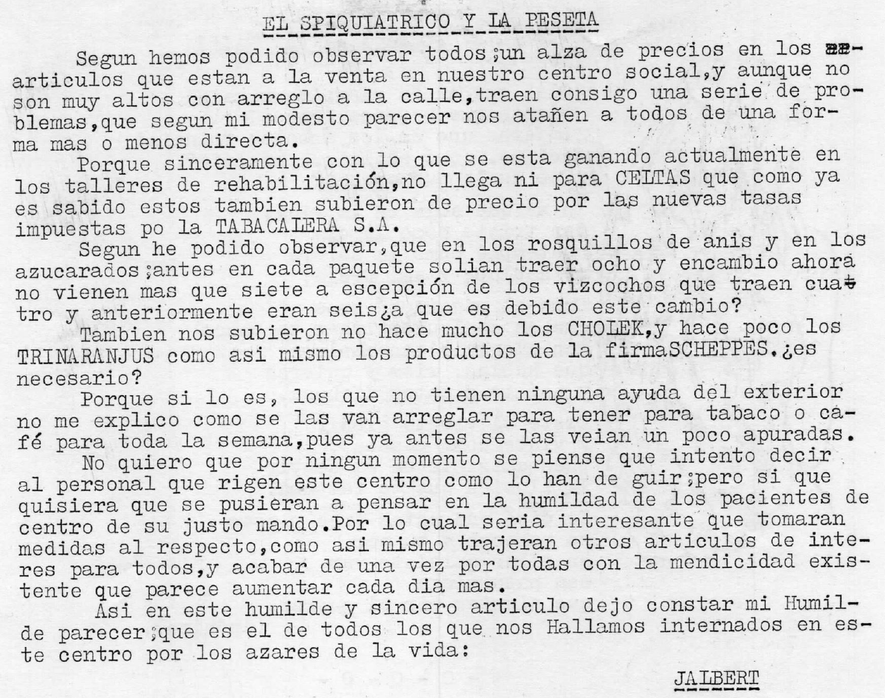 Un tema recurrente es el relativo a la economía personal y los magros ingresos que les aportaba la laborterapia. De hecho, se quejan de ese escaso dinero de bolsillo que debía servir para el entretenimiento y los pequeños “vicios” en el bar, ya que consideraban que el tabaco, el café y otros pequeños artículos de alimentación u objetos de consumo eran caros, tal y como se refleja candorosamente en el artículo “El psiquiátrico y la peseta” (Imagen 3).