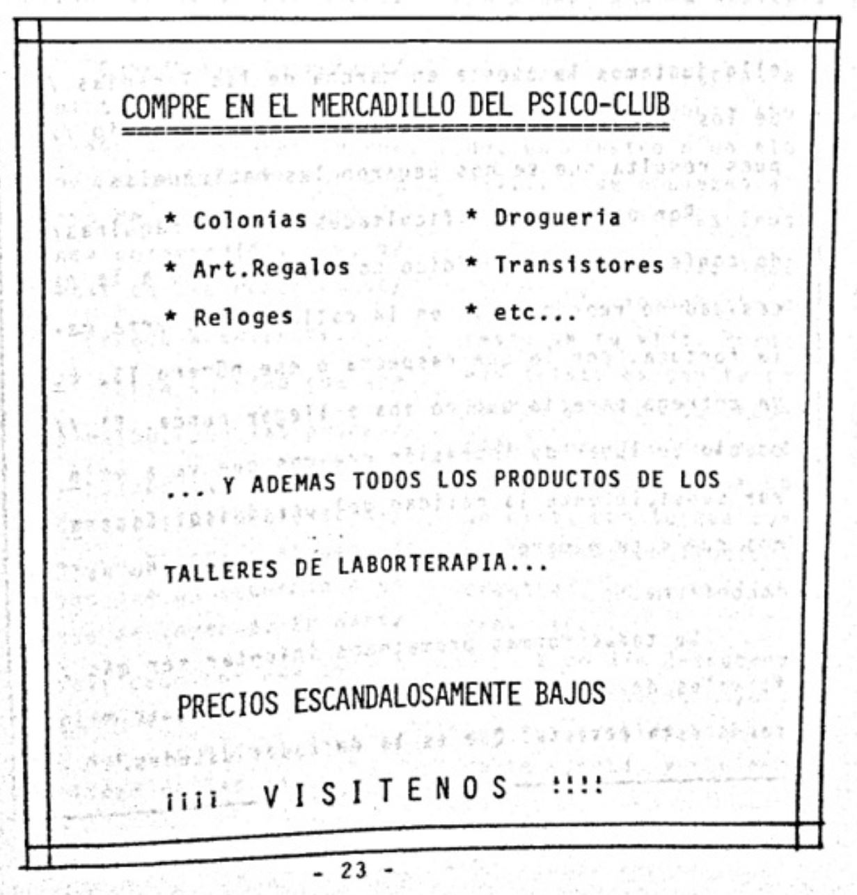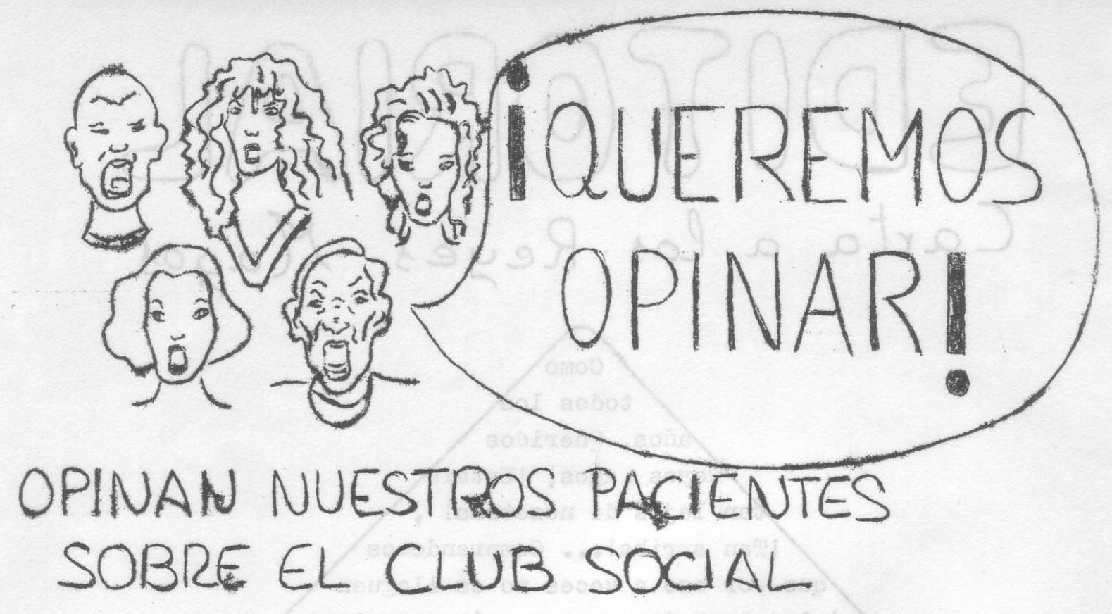 Las declaraciones de “un paciente” reflejan esa función terapéutica que se le otorgaba: El Club social (…) procura reavivar la capacidad de diálogo de los pacientes mediante reuniones periódicas del Comité Rector, donde se discuten y aprueban las cuestiones internas del club. Y es un cauce terapéutico que crea también nuevos puestos de trabajo. Estos dos factores, trabajo y diálogo, son fundamentales para la rehabilitación total del paciente, ya que en su largo internamiento pierde contacto con la realidad social y se acostumbra a vivir en un lugar que primeramente es una cárcel para él, pero que después termina siendo un asilo o refugio (Ren. 1976; abril:7).
