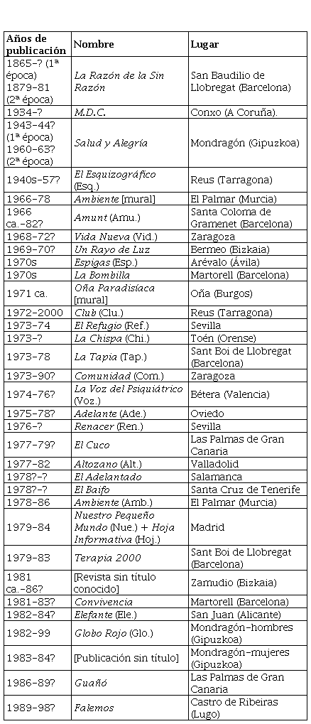 Este texto es el resultado de la revisión de algunas publicaciones internas de hospitales psiquiátricos españoles de mediados de los años 50 a finales de los 80 (Tabla 1)[2]. Un periodo especialmente interesante, pues, en los años finales de la dictadura y transición posterior transición, las grandes instituciones afrontaban los necesarios movimientos de reforma (24,25, 26).