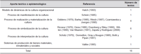 La mayoría de textos consultados (Ver Tabla 1) datan de las últimas tres décadas del siglo pasado, esto se debe a que en este periodo se desarrollaron los mayores aportes teóricos a la perspectiva interpretativa-simbólica para la descripción y análisis de lo cultural a nivel específico en las organizaciones (Zapata y Rodríguez, 2008). Ya en el siglo XXI, los investigadores y estudiosos en el tema de organizaciones retoman estas bases fundamentales para darle soporte epistemológico a sus propósitos de intervención y transformación de la cultura organizacional.