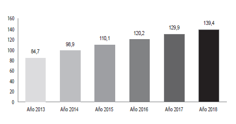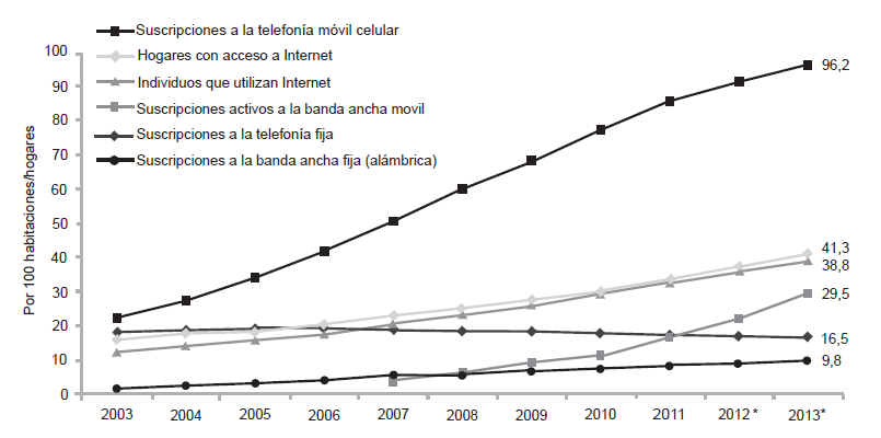 La Figura 1 (pág. 130) muestra el desarrollo histórico de las TIC (banda ancha, teléfonos fijos, banda ancha móvil, personas que usan Internet, hogares con Internet y teléfonos celulares), por cada cien habitantes, en donde el mayor avance se ha dado con los teléfonos móviles. Internet de su parte, se muestra en segundo lugar en el avance y desarrollo de TIC en el periodo 2003-2013.