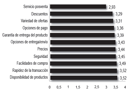 De otra parte, la Figura 10 (pág. 133) presenta los resultados de la Encuesta AméricaEconomía Intelligence (2012), señalando las principales variables consideradas por un comprador digital en Internet, en el momento de tomar una decisión de compra. Las más destacadas en esta decisión actualmente son: disponibilidad del producto, rapidez de la transacción, facilidad de compra, seguridad en el pago y compra. Las variables menos consideradas son: servicio de posventa, descuentos y variedad de ofertas.