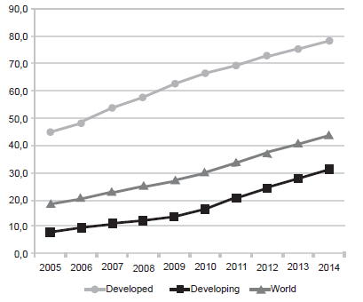 La Figura 2, de su parte, presenta el uso de Internet por regiones económicas. Los países desarrollados expresan su máxima preponderancia. Se destaca la brecha en el uso de Internet entre los países desarrollados y en proceso de desarrollo, señalando la importancia de estas tecnologías en la EC, para el avance de una región.