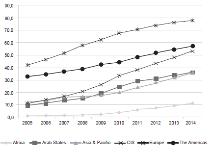 En la Figura 3 se observa el uso de Internet por regiones geográficas. Europa expresa su liderazgo, seguido de las Américas y de países del CIS1, estados árabes, Asia-Pacífico y África en menor grado.