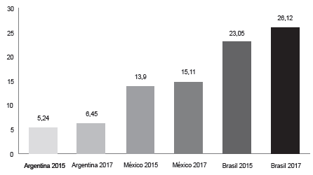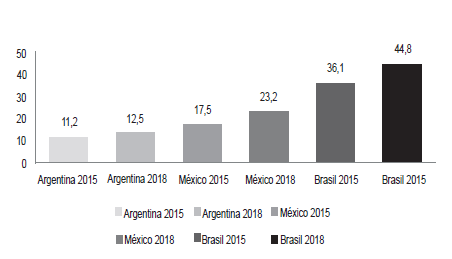 Los países de América Latina que mayor número de compradores tienen en Internet son Argentina, México y Brasil, con 11,2; 17,5 y 36,1 respectivamente. En ellos se espera un crecimiento para el año 2018 a 12,5; 23,2 y 44,8 correspondientemente (statista.com, 2015). (Ver Figura 8).